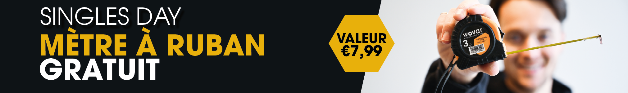 Pendant la Singles Week, nous célébrons non seulement les célibataires, mais aussi vos projets de bricolage ! Que vous ayez l’intention de commencer un nouveau projet, de terminer d’anciens travaux ou de simplement compléter votre boîte à outils, cette semaine, nous sommes là pour vous aider. Recevez gratuitement un mètre de 3 mètres d’une valeur de 7,99 € pour toute commande de 50 € ou plus (TVA incluse) avec le code : SINGLESDAY.