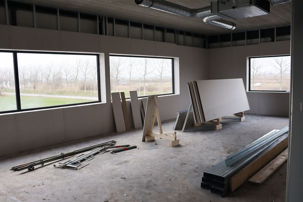 Ce à quoi ressemblera bientôt le bâtiment est de plus en plus visible. Vous pouvez même déjà monter à l'étage ! Au premier étage, vous pouvez voir où seront bientôt situés les différents bureaux, car des cloisons sont déjà montées entre les pièces. Lorsque vous êtes à l'étage, vous avez une vue panoramique sur toute la zone industrielle à travers les grandes fenêtres. Quelle vue !